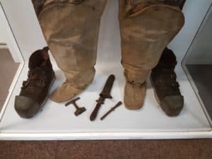The largest collection is in the room immediately off the entrance. It includes local history regarding the establishment of the area and local maritime history such as that on the local boat builders. It is in this room that the standard dress diving equipment is displayed. This was used on the NSW south coast in the early 1900s. It consists of a Siebe Gorman single cylinder pump, a Siebe Gorman pearler helmet, hose, dress, boots, knife and fake chest weights.